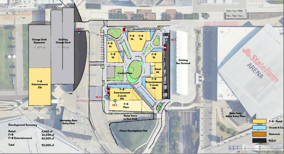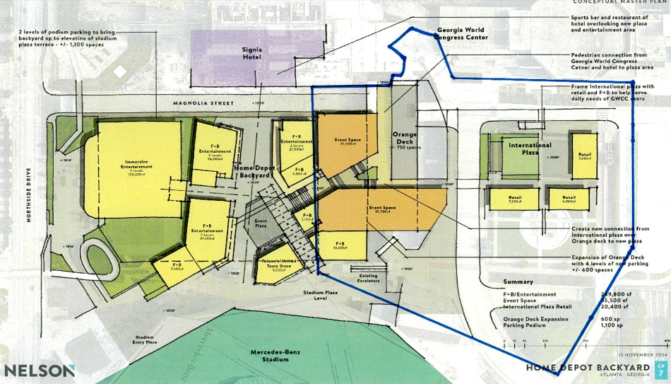 According to the September presentation, the scope of the International Plaza project could include: an expansion of the Orange Deck (a parking deck overlooking Home Depot Backyard); fixes for the aging Red Deck and bridges; enhancements on adjacent roadways; and a spruce-up for the nearby Signia by Hilton Atlanta hotel plaza.